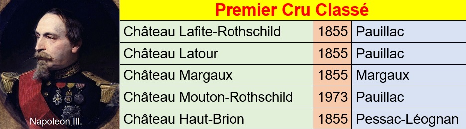 In the 19th century, the famous 1855 Bordeaux Classification was instituted by Emperor Napoleon III, the nephew of Napoleon Bonaparte (a wine connoisseur himself), to showcase France’s top wines at the international Exposition Universelle de Paris. It ranks 61 chateaux from the Médoc (and Château Haut-Brion from Graves) and 27 sweet wine producers from Barsac and Sauternes into five quality levels, first to fifth growths. These rankings remain largely unchanged today.